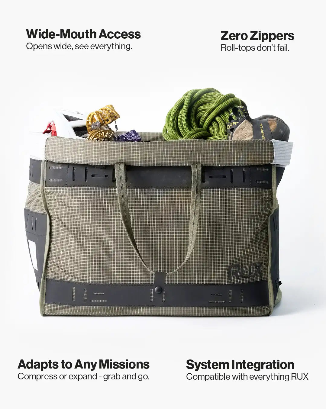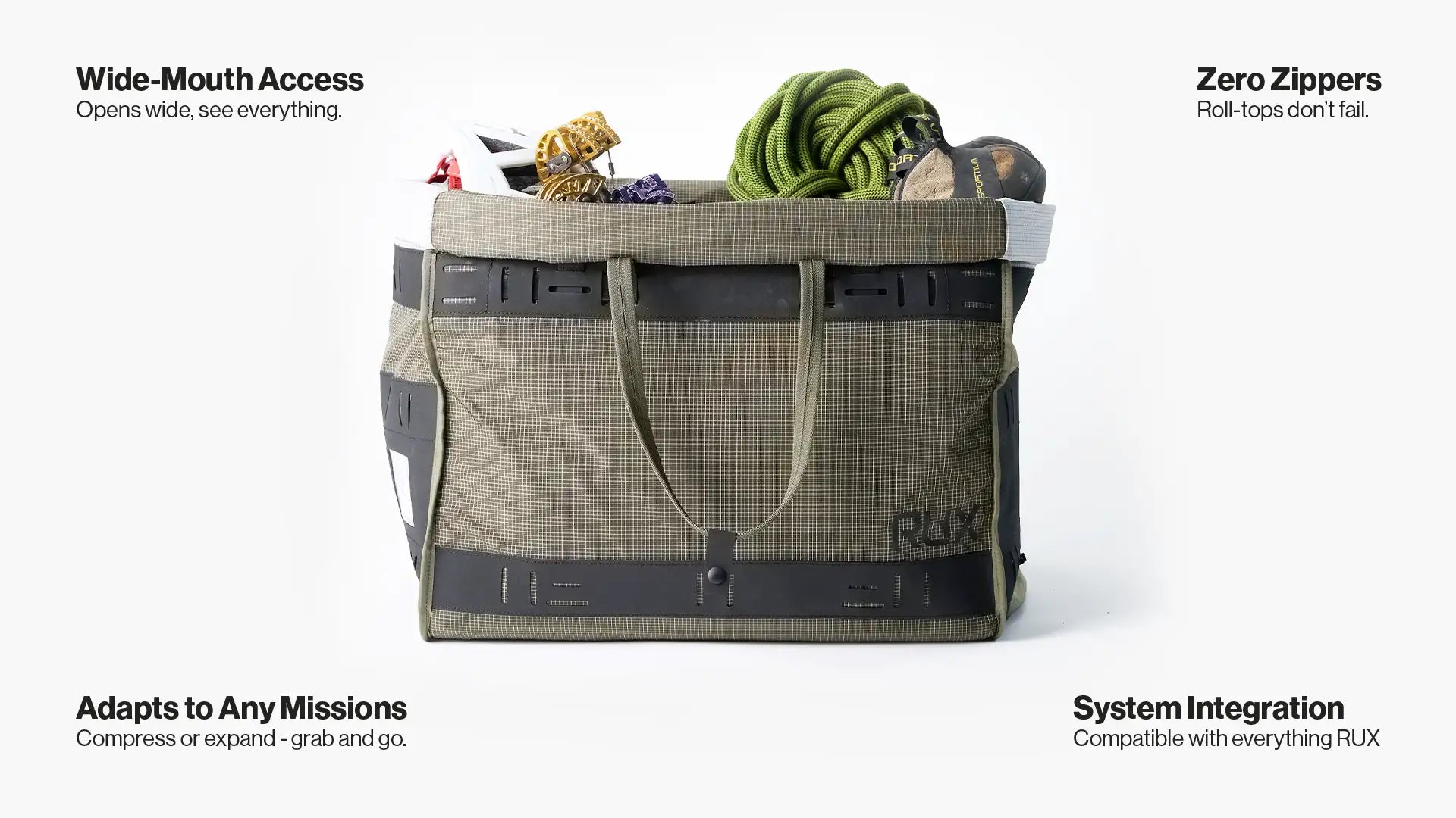 Five years ago we invented wide-mouth packing with the RUX 70L Gear Box. Now, we're bringing that same DNA to the duffel - making it lighter, softer, and ready for everything from carry-on flights to backcountry missions.