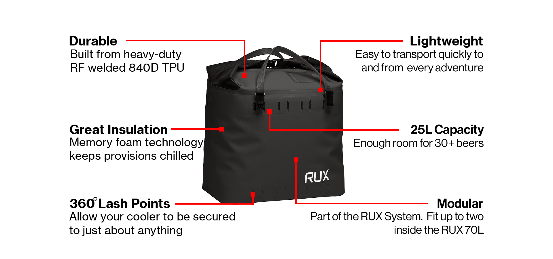 • Deux sacs isothermes peuvent être placés dans un RUX 70L. Quatre glacières peuvent être placées dans ce sac isotherme.