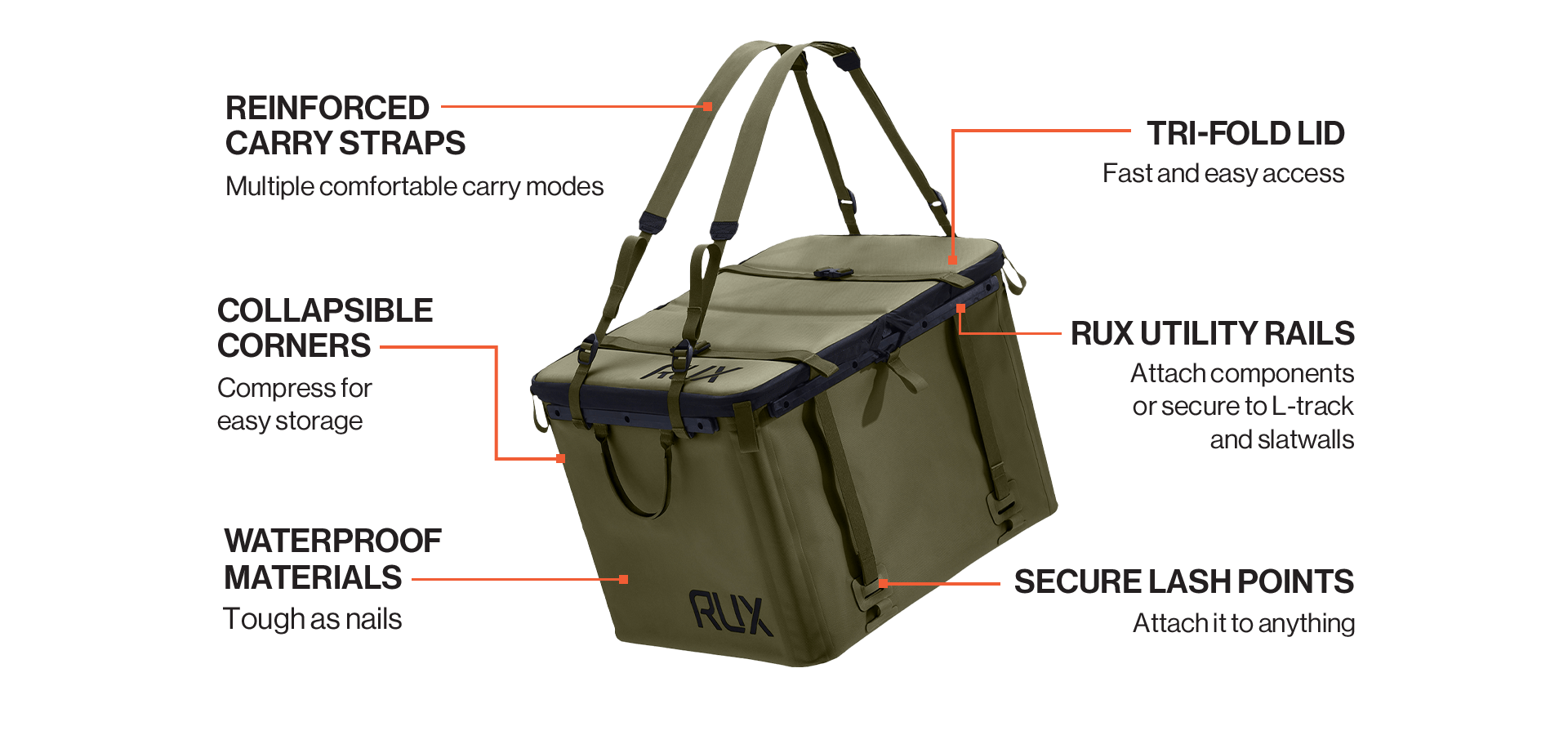 - Organisation de niveau supérieur: RUX 70L est le sac de transport de matériel pliable original de grande capacité pour des aventures sans tracas dans toutes les conditions. TRIPLE RUX 70L fera passer votre organisation de matériel au niveau supérieur !
