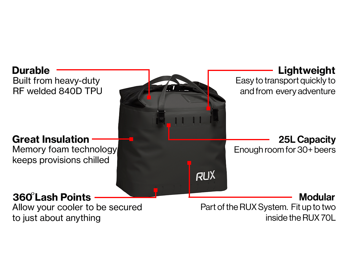 • Two Cooler Bags fit inside a RUX 70L. Four Cooler Cubes fit inside this Cooler Bag.