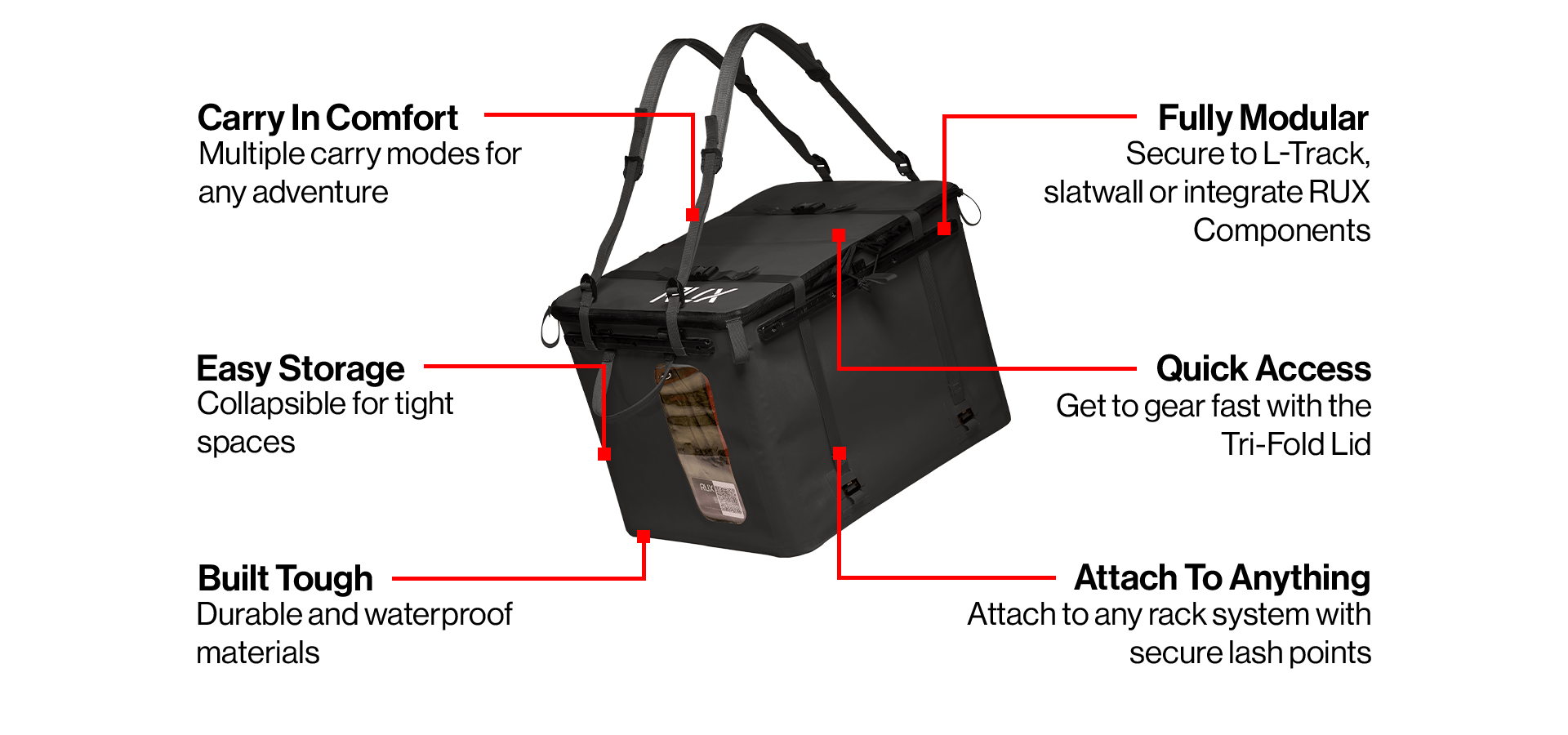 Less junkshow packing and transferring between bins, bags, cases and roof boxes. RUX saves time and space every step of the way from garage, to truck, to trailhead.