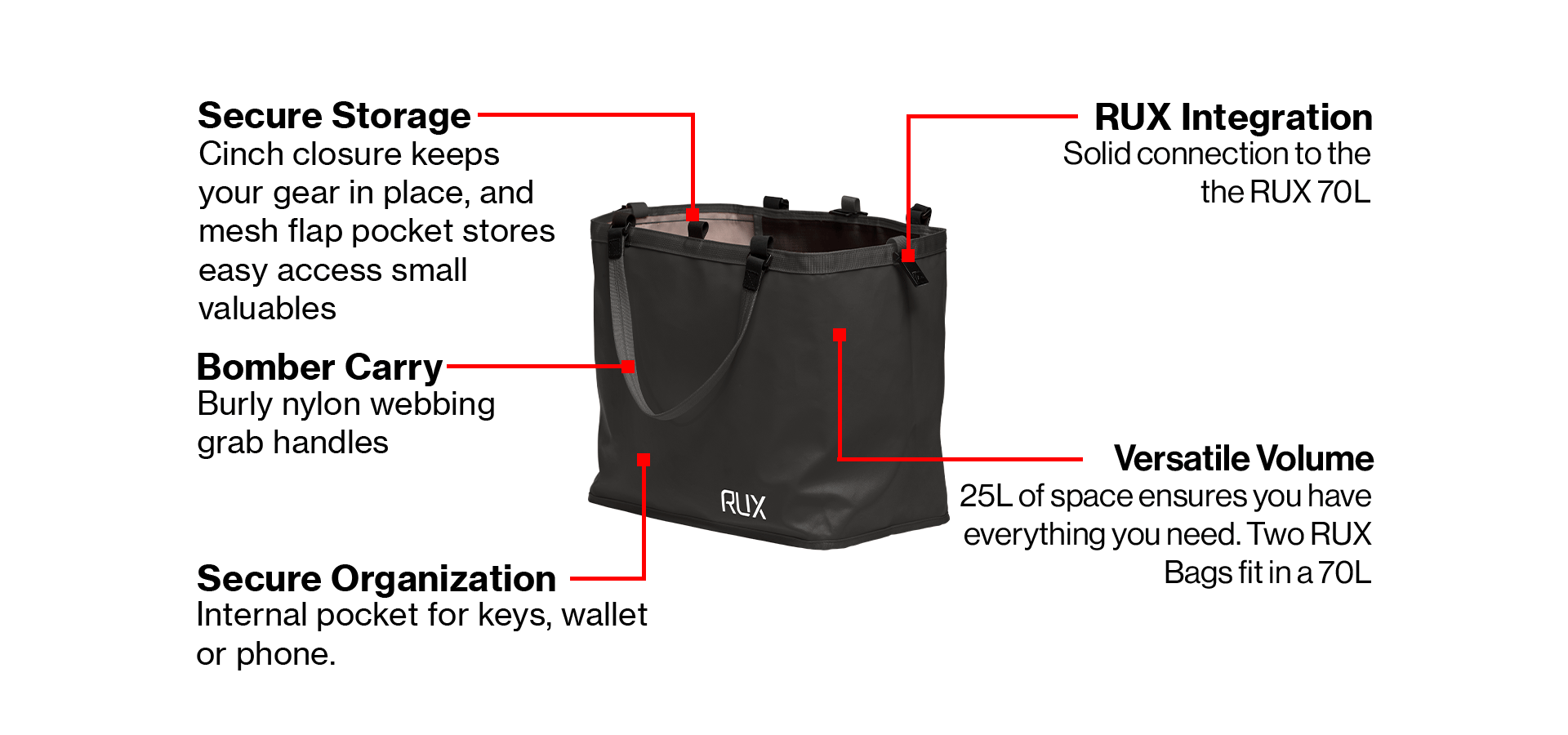Versatile, easy to pack 'n grab 25L bag that nests inside the RUX 70L, conveniently dividing up your storage space. Incredibly handy for everyday use from the market to the campsite.