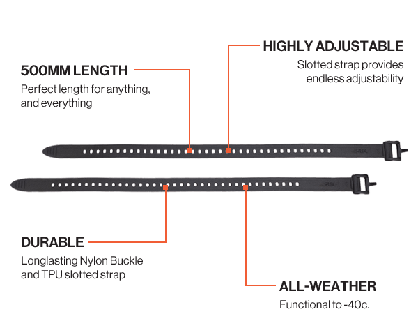 The ‘do-anything’ straps. Flexible, durable polyurethane straps to lash your RUX 70L or Waterproof Bag to your vehicle, ATV, cargo bike, snowmobile, boat, or wherever else you need it.